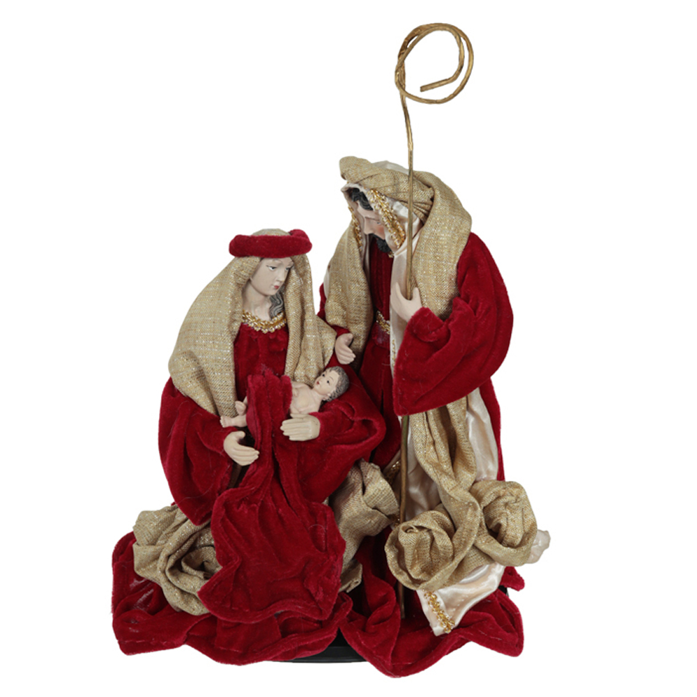 Este presépio encantador em resina une Jesus, Maria e José em uma única peça, com as figuras elegantemente vestidas em tecidos na cor vermelha. A combinação do material durável e dos detalhes em tecido traz um toque sofisticado e acolhedor à sua decoração natalina.